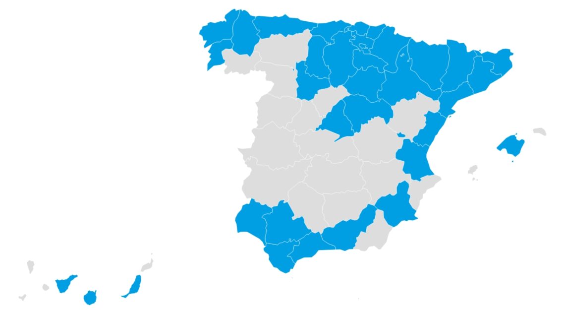 Gracias a su cobertura geográfica, el distribuidor cubre las provincias de Cádiz, Granada, Málaga, Sevilla, Huelva, Huesca, Zaragoza, Asturias, Cantabria, Guadalajara, Burgos, Palencia, Soria, Valladolid, Barcelona, Girona, Lleida, Tarragona, Castellón, Valencia, Álava, Vizcaya, Guipúzcoa, A Coruña, Lugo, Pontevedra, Islas Baleares, Las Palmas, Santa Cruz de Tenerife, La Rioja, Madrid, Navarra y, próximamente, Murcia.
