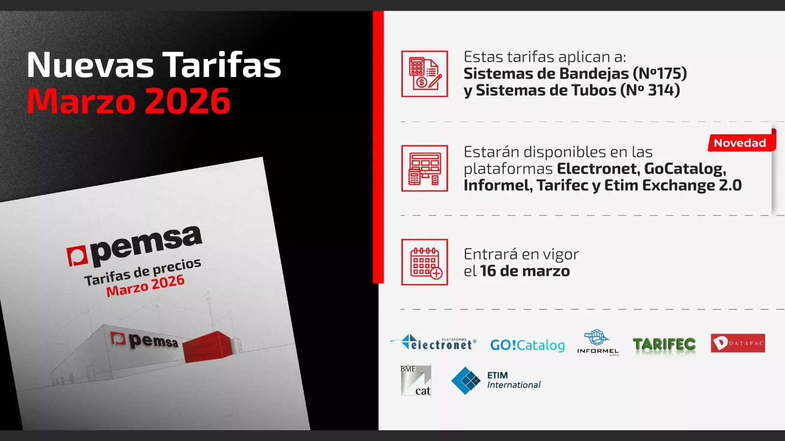 Pemsa ha anunciado el lanzamiento de su nueva lista de precios nº175 (para sistemas de Bandejas Portacables, Soportes y Accesorios), y la tarifa nº315 (para los sistemas de Tubos, Racores y Pensaestopas). La compañía especializada en sistemas de conducción de cables indica que ambas entrarán en vigor el próximo 16 de marzo. Asimismo, incorporan una actualización completa de precios y disponibilidad de producto.